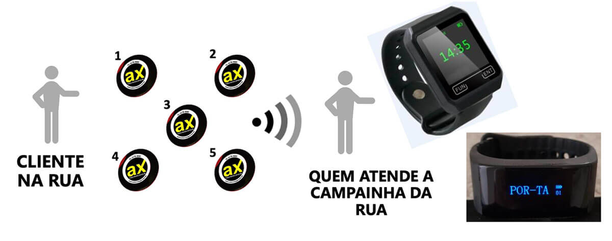 A campainha emissora, nesse caso, funciona como uma campainha de rua, porém sem sinal sonoro. A Informação de que alguém chegou, aparece direto no relógio do interessado, poupando os cães de excitação por conta do tocar da campainha. Muito apelo para creches e ambientes com cachorros que se incomodam com o sinal sonoro de campainha.